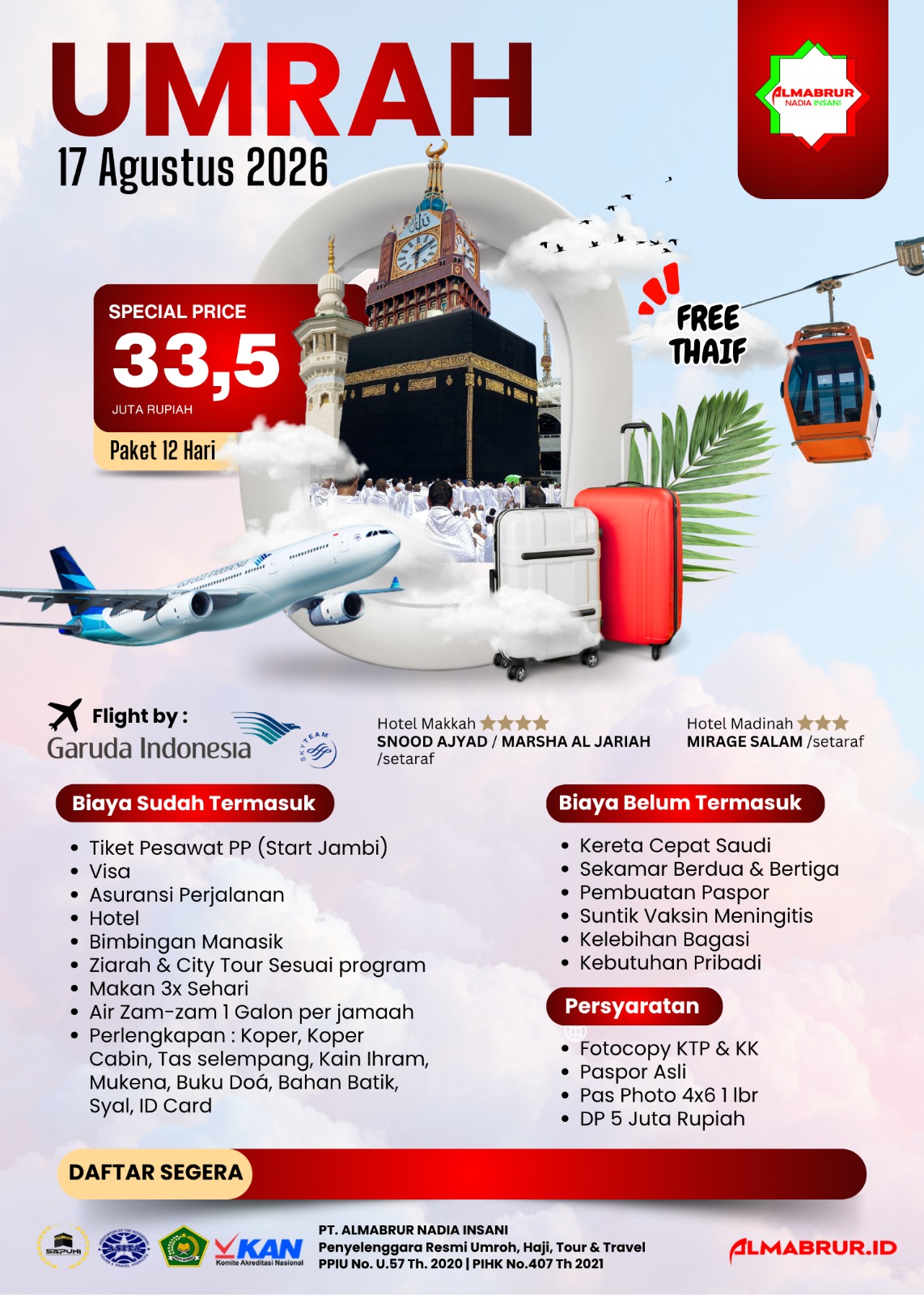 Nikmati perjalanan ibadah nyaman dan terpercaya bersama PT Almabrur Nadia Insani.