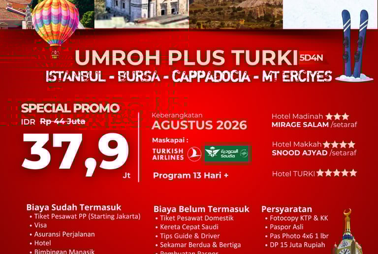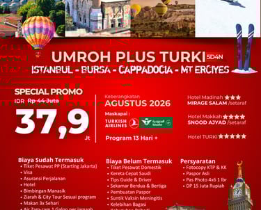 Nikmati kenyamanan maksimal dengan Umroh Plus Turki selama 15 hari perjalanan umroh.