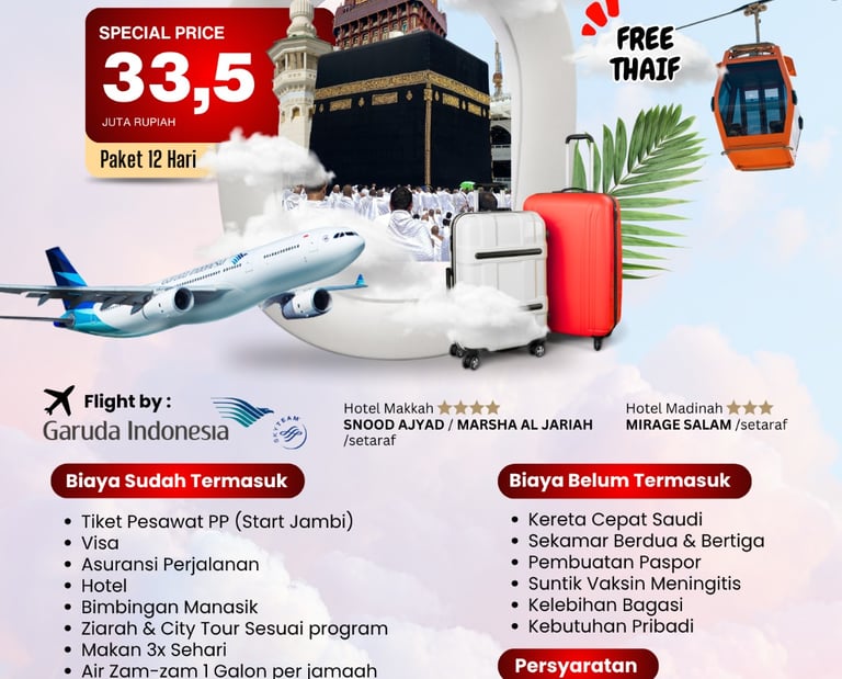Nikmati kenyamanan maksimal dengan hotel bintang 5 dan pendamping ibadah profesional selama 12 hari perjalanan umroh.